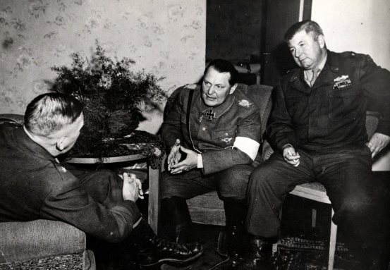 The second most powerful man in the state, Reich’s Marshal Hermann Goering, finds a way to contact the 36th Division of the U.S. 7th Army through Colonel Bernd von Brauchitsch. At the agreed location, Brigadier-General Robert J. Stack and the Reich’s Marshal meet. Goering raises his marshal’s baton and the American general salutes. Should it not still be possible for victor and vanquished to face each other chivalrously — as after Sedan in 1871 and at Compiègne in 1940? On that occasion the victorious generals Keitel and Jodl had accorded military dignity to Marshal Petain and General Huntziger.